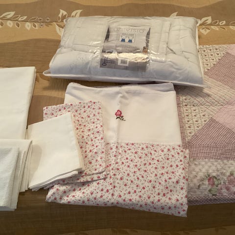 Mitat : peitto 150 cm x 116 cm , pussilakana 152 cm x 125 cm, tyynyliinat 60 cm x 40 cm ja tyyny 50 cm x 32 cm .Yhteishinta 10e. Katso minulla on muitakin myytäviä.