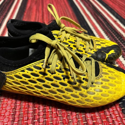 Puma Future jalkapallokengät koko 34, väriltään musta ja vihreä. Kengissä on kumipohja, joka sopii nurmipintaisille kentille. Kengät on suunniteltu tarjoamaan tukea ja mukavuutta jalkapallon pelaamiseen.