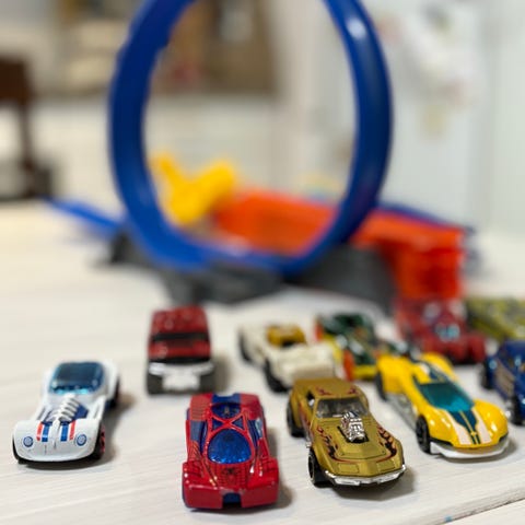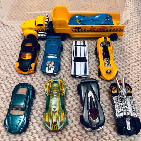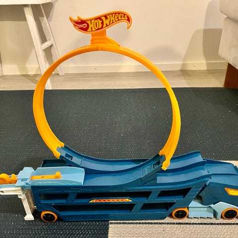 Hot Wheels autorata, kuljetusrekka ja autoja.