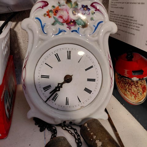 Vanha ruskeaa puuta oleva kello. Kello ei toimi tällä hetkellä tai en osaa sitä ainakaan käyttää. Kuvassa näkyvät tavarat kuuluvat kelloon.
