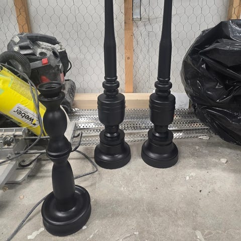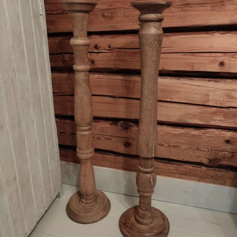 Kaksi vanhaa puista, valkoisiksi maalatut kynttilänjalat. Korkeus 72,5cm ja 79,5 cm. Sopivat kynttilät 5,5 ja 9,5 cm kokoiset. H. Yht. 20e