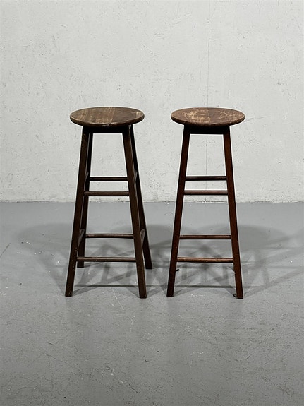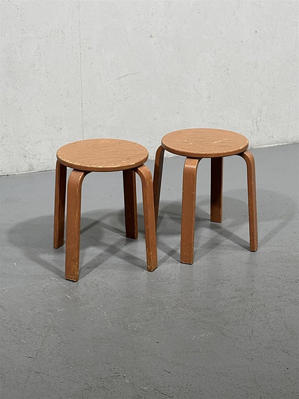 Tuolien maalipinta on kulunut, ja molemmissa on näkyviä naarmuja ja lohkeamia. Valkoisen tuolin istuimessa on huomattavia kulumia, ja mustassa tuolissa on naarmuja selkänojassa. Kuluminen antaa tuoleille rustiikkisen ilmeen.