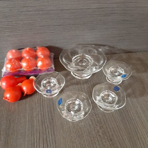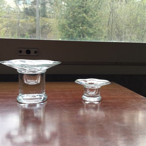 Kaksi Kerttu Nurmisen Nuutajärven Lasille 1970-luvulla suunnittelemaa Lumme-kynttilänjalkaa.