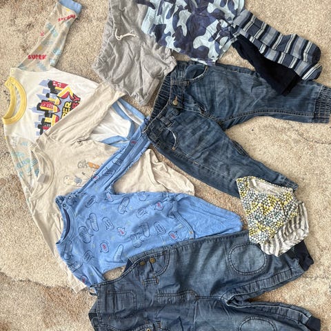 Myydään kuvan kohtalaisessa kunnossa olevat vaatteet pakettina. Arviona koko 86, sillä kaikissa ei kokolappua ole.