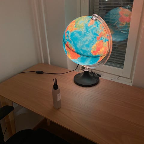 Vanha maapallo valolla, korkeus n.35cm. Muutamasta kohdasta puuttuu saumaviivaa, näkyy kuvissa.