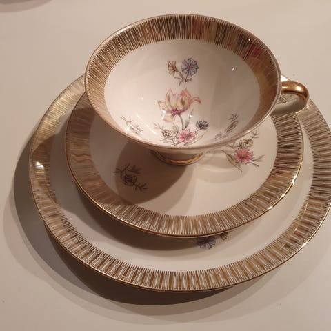 Suloinen 10 kappaleen kahvi astiasto. Muutamassa kahvikupin alus lautasessa halkeamaa.