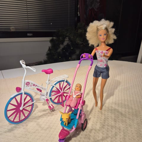 Myyntiin barbien vauva tarvikkeineen. Vauva 7 cm pitkä. Paketissa mm. Vaunut, potta, turvakaukalo, pyörän istuin, tuttipulloja, leluja.... Kaikki näkyy kuvassa.