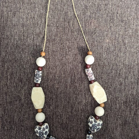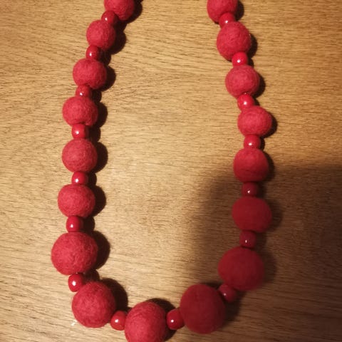 Jouluaiheinen kaulakoru. Mustassa nauhassa 7 kpl punaisia, pyöreitä huopapalloja ja 8 kpl vihreitä, soikeita huopapalloja.