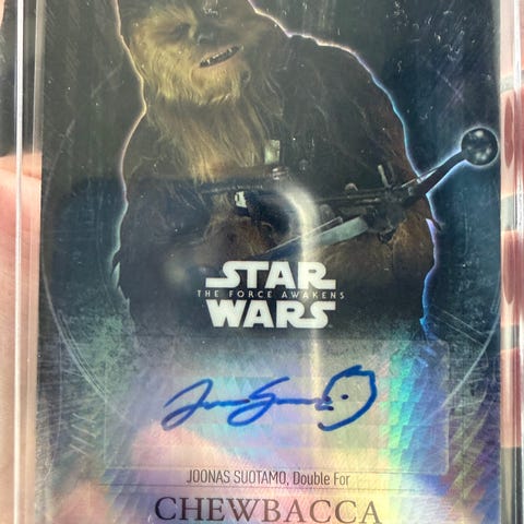 Hasbro Star Wars Chewbacca naamio, valmistettu muovista, ruskea väri. Naamiossa on kuminauha kiinnitystä varten. Naamiosta kuului Chewbaccan ääniä kun aukaisee suu osaa. Toimii paristoilla.