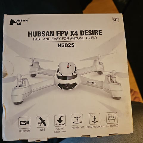 Myydään Hubsan-merkkinen kameradrone. Drone on hyvässä kunnossa ja lentää hyvin eikä ole koskaan pudonnut/törmännyt johonkin. Dronesta löytyy kiinteä kamera sekä gps hold ja return to home -ominaisuudet. Kameran näkymä sekä muuta dataa näkyy ohjaimen näytöllä. Dronen lentoaika on noin 20 min ja ohjaimen kantama on testattu noin 700 metriin asti. Akkuja on pidetty säilytysjännitteessä aina kun mahdollista, joten ne ovat hyvässä kunnossa.