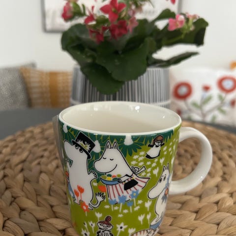 Arabia Tove 100 muki, koristeltu kuvituksella, valmistettu keraamisesta materiaalista.