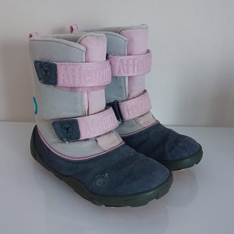 Affenzahn Koala talvikengät. Paljasjalkakengät, jossa villasekoite vuori (70%). Vedenpitävät, kalvot kengissä. Yhdellä varovaisella tytöllä ja sirojalkainen ollut yhden talven käytössä. Olivat todella tykätyt ja mukavat kengät.