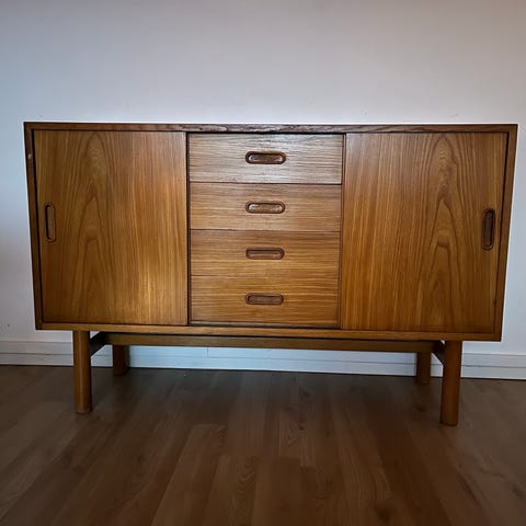 Harmillisesti ulkomaille muuton vuoksi joudun luopumaan ihanasta teaksenkistäni. Senkin kunto on hyvä joskin ajan tuomaa kaunista patinaa siitä löytyy. Pinta on juuri öljytty uudelleen. Jalat ovat siror puujalat, jotka tuovat senkkiin ihanaa keveyttä. Nouto Lauttasaaresta.
