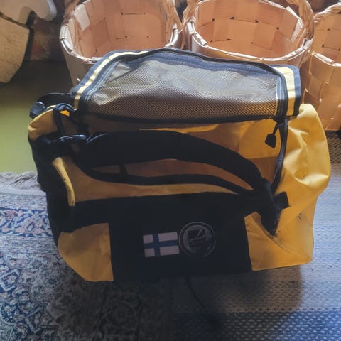 Myydään mittatilaustyönä teetetty kassi maailmanympäryspurjehdukselle Roxanne 1990-91. Kuminen liukumaton pohja. Vanha mutta Topakka ehjä säänkestävä kassi.