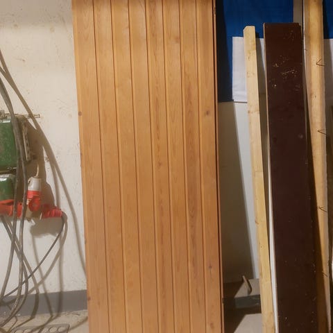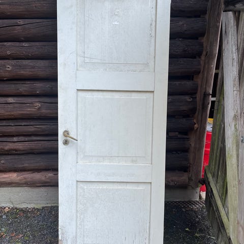 Musta puuovi ja siihen kuuluva kehys. Ovi sisältää lasiosat, joissa on maitolasi, oven kahvat ja yksi avain. Soveltuu sisäänkäynti- tai sisäovikäyttöön. Mitat 10x21.