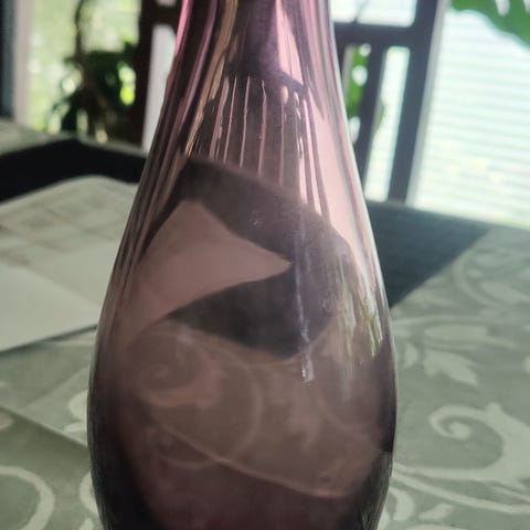 Aimo Okkolin Riihimäen lasin Nimipäivä maljakko. Lasiin muodostunut sameutta, ei ole yritetty puhdistaa.