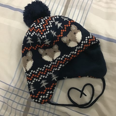 Myynnissä ihana ja tosi lämmin, fleecevuorillinen tupsupipo. Edellinen omistaja on leikannut laput irti, mutta arvio koosta 74/80.
