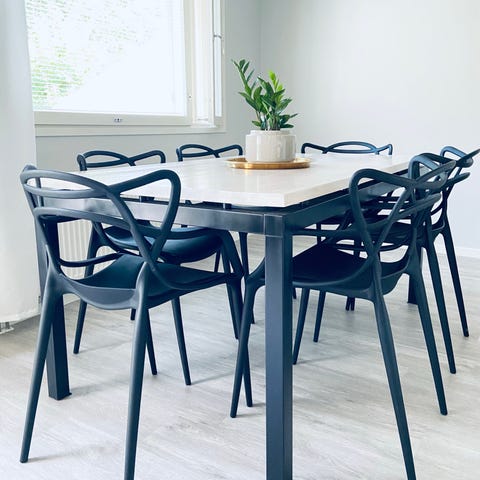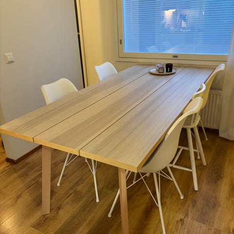 Ruokapöydän taso on öljyttyä massiivitammea, jalat mustaksi maalattua metallia.