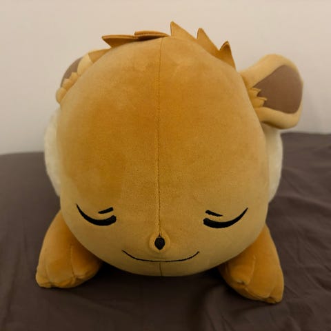 Pokemon pehmolelu 50 cm Eevee nukkuu tyytyväisenä. Se on ihanan pehmeä ja tavallista pehmolelua panavampi. Pehmolelun voi ottaa minne vain mukaan ja siitä tulee helposti lapsen lempi ja turvallinen leikki- sekä unikaveri. Pehmolelun pituus on noin 50 cm ja korkeus 26 cm.Ikäsuositus: 2+ vuotta.
