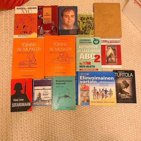 Kirjapaketti sisältää useita kirjoja eri kirjoittajilta ja eri aihealueilta. Kirjat ovat erikokoisia ja eri värisiä kansiltaan. Sopii lukemiseen ja kirjallisuuden harrastukseen. 2€/kpl.
