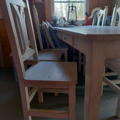 Kaupan päälle 6 pöytään kuuluvaa tuolia, joiden istuinpäällisissä huomattavissa määrin lankapakoja. Tuolien puuosat hyvässä kunnossa.