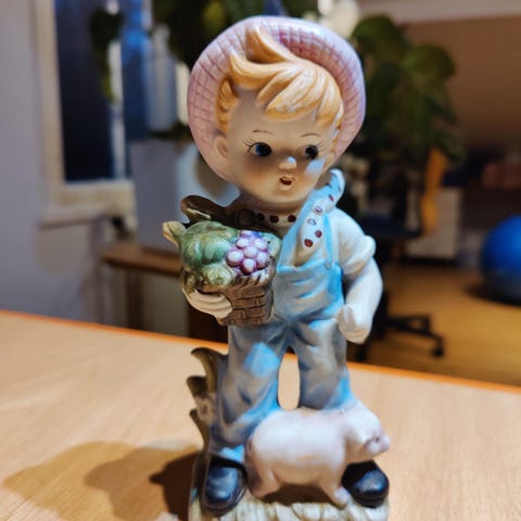 Myydään kuvien mukainen Lapsi ja koira posliinifiguuri. Lapsi ja koira katselevat toisiansa ja jalustassa lukee "Etkö osaa puhua". Valkoisen posliinifiguurin pinta on kiiltävä, lasitettu ja virheetön.