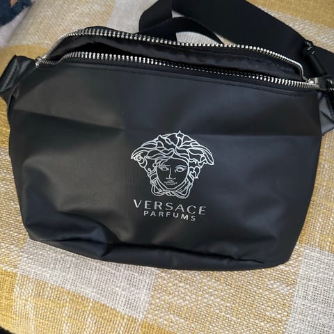 Versacen säkkireppu, kahva nahkaa sekä materiaalina paksu nylon. Oikein hyvässä kunnossa, en löydä moitittavaa. Mukaan suojapussi, aitous todistuu kätevästi tägin certilogolla. Ostettu Zalandosta.