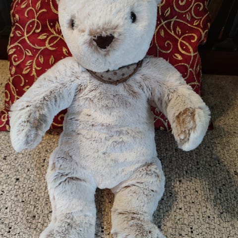 Pehmolelu nalle, jossa on vaalea turkki ja valkoinen pitsinen mekko. Soveltuu lasten leikkeihin ja koristeeksi. Bukowski Design.
