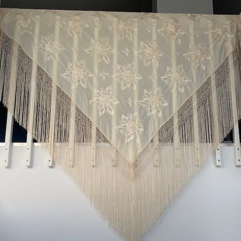 Materiaali silkki ja "metallinen" lurex-lanka, koko 53cm×183cm hapsuineen.Tuotu 70-luvulla Kiinasta.