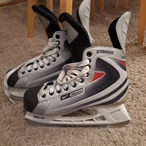 Bauer TF9 jääkiekkoluistimet, musta ja sininen väri. Luistimet on suunniteltu jääkiekkoon ja niissä on valkoinen terä. Luistimet sopivat jääkiekkoharrastukseen.