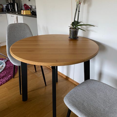 Pieni pyöreä pöytä, vaikka sohvapöydäksi nyt edullisesti. Pyöreä kansi on savutammen väristä 3d-laminaattia. Kannen halkaisija on 60 cm.
