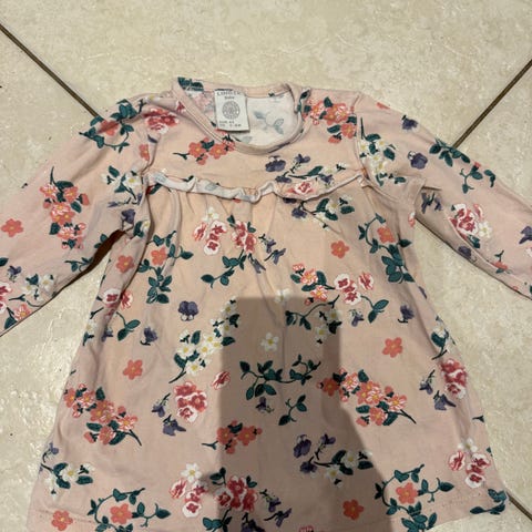 Lindex Kirjava lasten mekko, koko 56 cm. Mallissa on kirjava kukkakuviointi ja lyhyet hihat.
