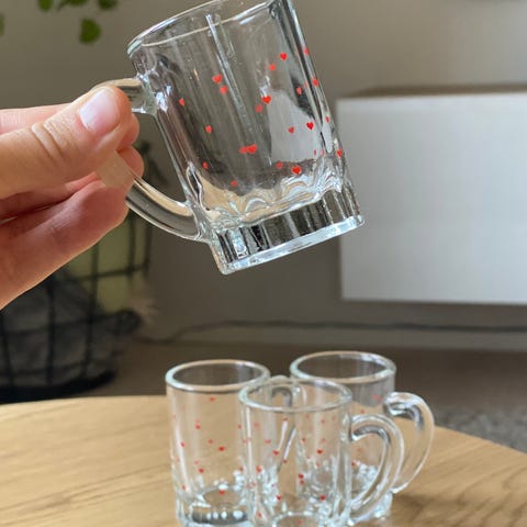 Lasten lasimuki on valmistettu lasista ja siinä on sinisellä painettu kuvitus, jossa on lapsi ja eläinhahmoja.