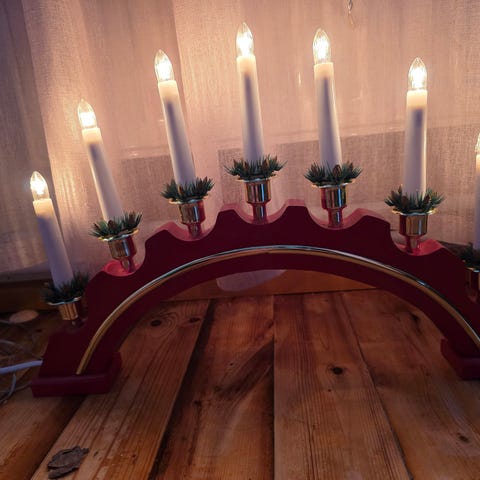 Perinteinen punainen kynttelikkö, jossa 7 kynttilää ja mansetit. Mikään valo ei lähde päälle, kun töpselin laittaa seinään, joten ilmeisesti kaikki polttimet tarvitsee vaihtaa tai varaosiksi.