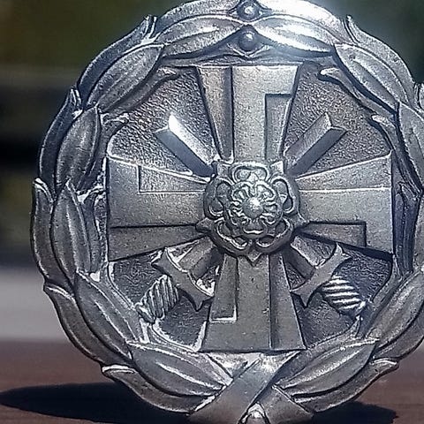 Tarjolla erinomaisessa kunnossa säilynyt haavoittumisen merkki, jonka mukana tulee alkuperäinen takaruuvikiinnitys. Aikakaudelle tyypillinen, siistikuntoinen yksilö, joka sopii hyvin kokoelmaan tai näyttelyesineeksi.