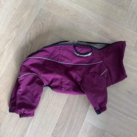 Siisti lämminvuorinen Rukan talvipuku koko 35cm neljällä lahkeella. Vyötäröllä ja kaulalla kiristysnyörit. Lahkeet säädettävissä tarroilla. Valjaita varten kolo selässä.