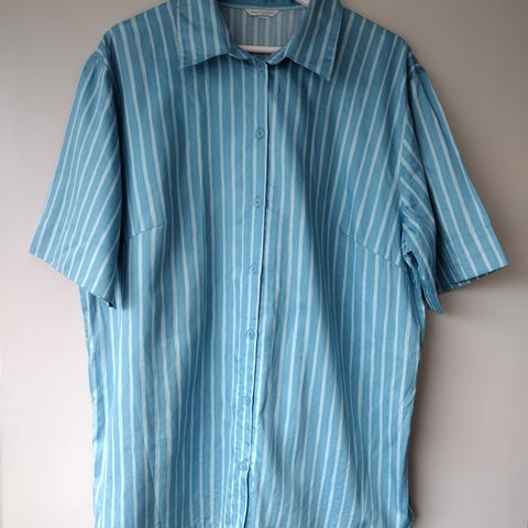 Marimekon hyväkuntoinen Jokapoikapaita. Unisex. Sininen valkoisilla raidoilla. Kainalo-kainalomitta 60 cm, pituus 75 cm.