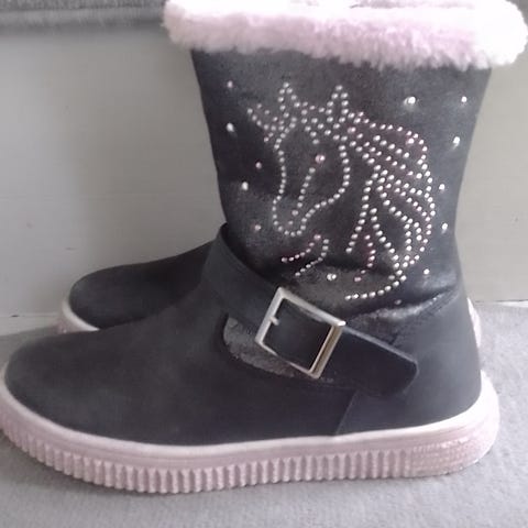 Myynnissä tyttöjen mustat saapikkaat koko 33. Pinnassa pieniä käytön jälkiä, mutta yleisilmeeltään siistit kengät. Kivoja yksityiskohtia ja sisäsyrjässä pitkä vetoketju.
