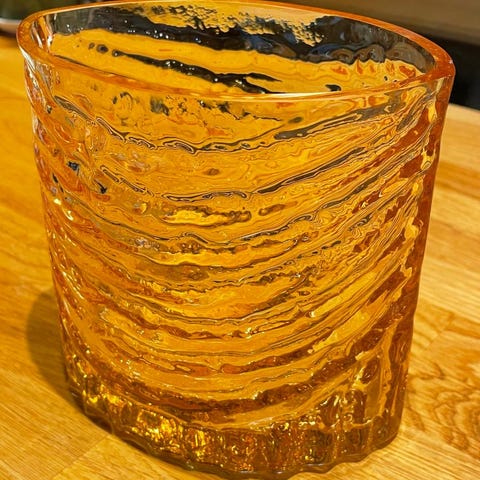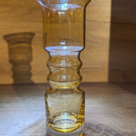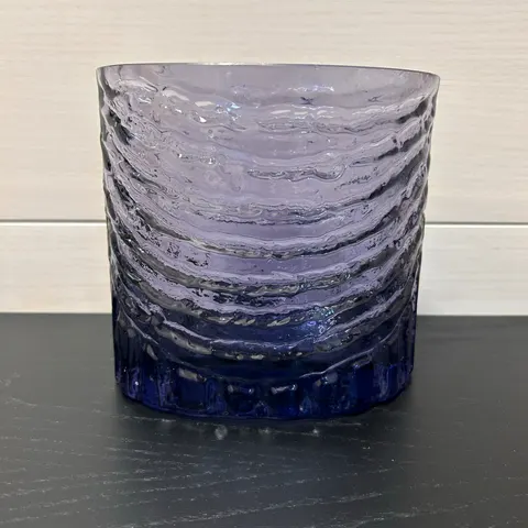 Mäntyharjun Lasin tuotantoa, design Eero Rislakki 60-luvun loppupuolella. Pyörittäen puhallettu ja rihlakoristeltu violetti maljakko. Ollut tuotannossa 1968-1971