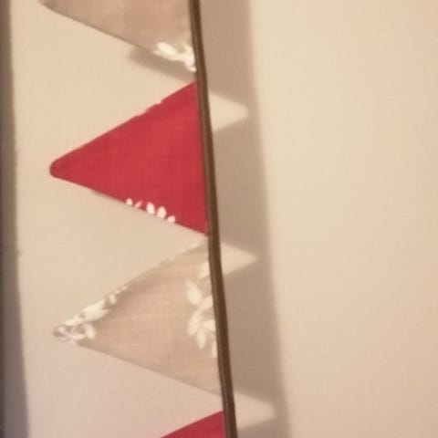 Käsityönä kankaista ommeltu pieni sisustus-viirinauha, pituus viirien kohdalta noin 56cm + nauhat. (viirit ovat kaksinkertaisesta kankaasta, reunaan ommeltu rustiikkisen näköinen siksak, myös enkelikuviot siksakilla kiinnitetty, viirit ovat erittäin tukevaa kierrätyspuuvillaa, mittoja kuvissa, nauha on uutta puuvilla nauhaa). Lisäkuvia saatavilla.