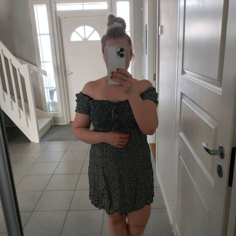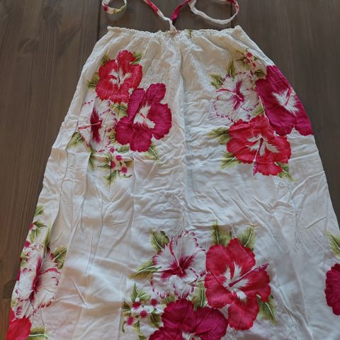 Ns. liukasta kangasta oleva mekko, koko L. Narut niskan takana sekä vyötäröllä. Noin polvipituinen.