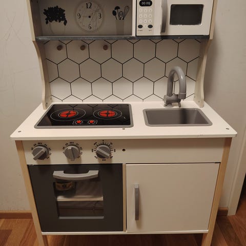 Vigan hyväkuntoinen pieni leikkikeittiö seuraavalle. Yksi koukkunuppi irronnut ja tilalle laitettu tarrakoukku.
