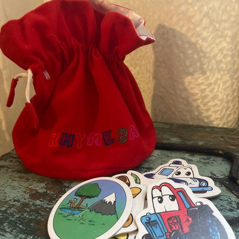 Laminoitutuja kuvia, joiden kääntöpuolella perinteisiä lastenloruja