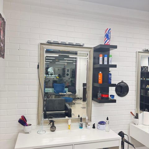 Kampaamokalusteet peileillä, pesupaikalla ja vastaanottotiskillä