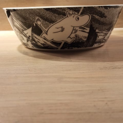 Siistikuntoinen, vähäisellä käytössä ollut Mustavalkoinen seikkailumuumi tarjoilukulho. Vetoisuus 2,5 litraa. Ei tarraa.