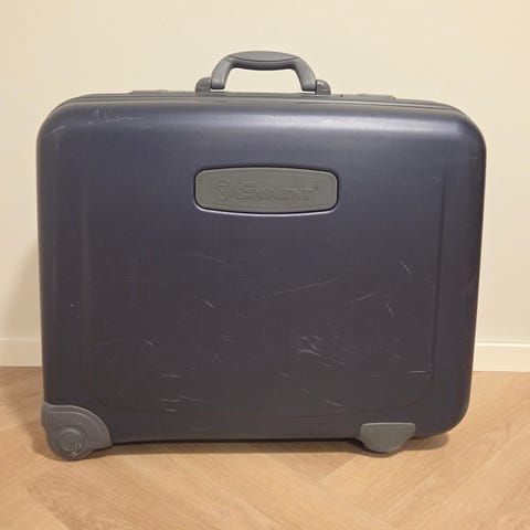 Iso ja tukeva matkalaukku. Merkki Eminent. Korkeus 60 cm, leveys 70 cm ja syvyys 24 cm. Pyörät alla, helppo kuljettaa. Kovakantinen.