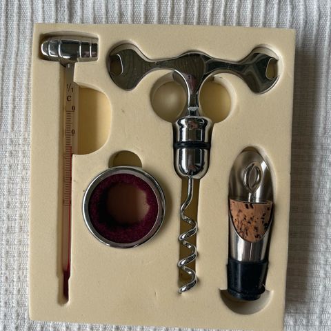 Viinisetti kauniissa rasiassa. Mukana temperoitumismittari, tipparengas, pullonavaaja viinipullonkorkille ja kruunukorkille sekä kaatonokka. Toinen settiin kuulumaton kaatonokka myös mukana.
