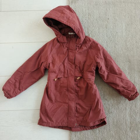 Vaaleanliila kevyttoppatakki irroitettavalla hupulla. Vasemmassa etutaskussa haalea tahra, muuten takki on ehjä eikä ole muita käytön jälkiä.
