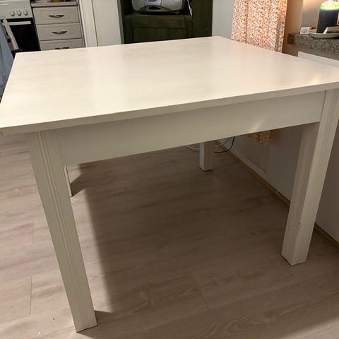 Valkoinen laadukas pieni ruokapöytä tai työpöytä. Pöytä on laadukasta puutavaraa, koska on vanha. Pöytälevyssä on kätevä kiinnitysmekanismi eli pöytälevyn saa helposti irti. Tukeva. Maalipinnassa näkyy käytön jälkiä, mutta on silti todella hyvä. Sopii hyvin esim. pieneen opiskelija-asuntoon.