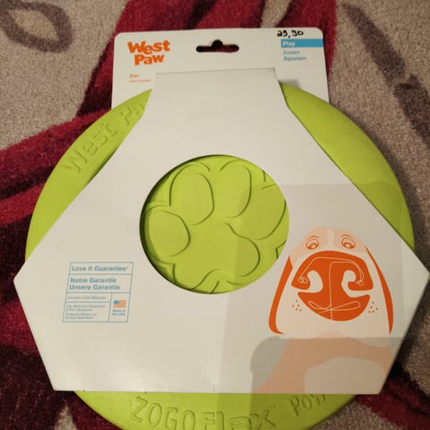 West Paw Zisc Play koiran frisbee (koko Large) on valmistettu pehmeästä, mutta kestävästä muovista. Frisbee on pimeässä hohtava, kelluva, kestävä, ei sisällä lateksia eikä myrkyllisiä ainesosia. Voi pestä astianpesukoneessa. Uusi, mutta pölyinen. Halkaisija 22 cm.